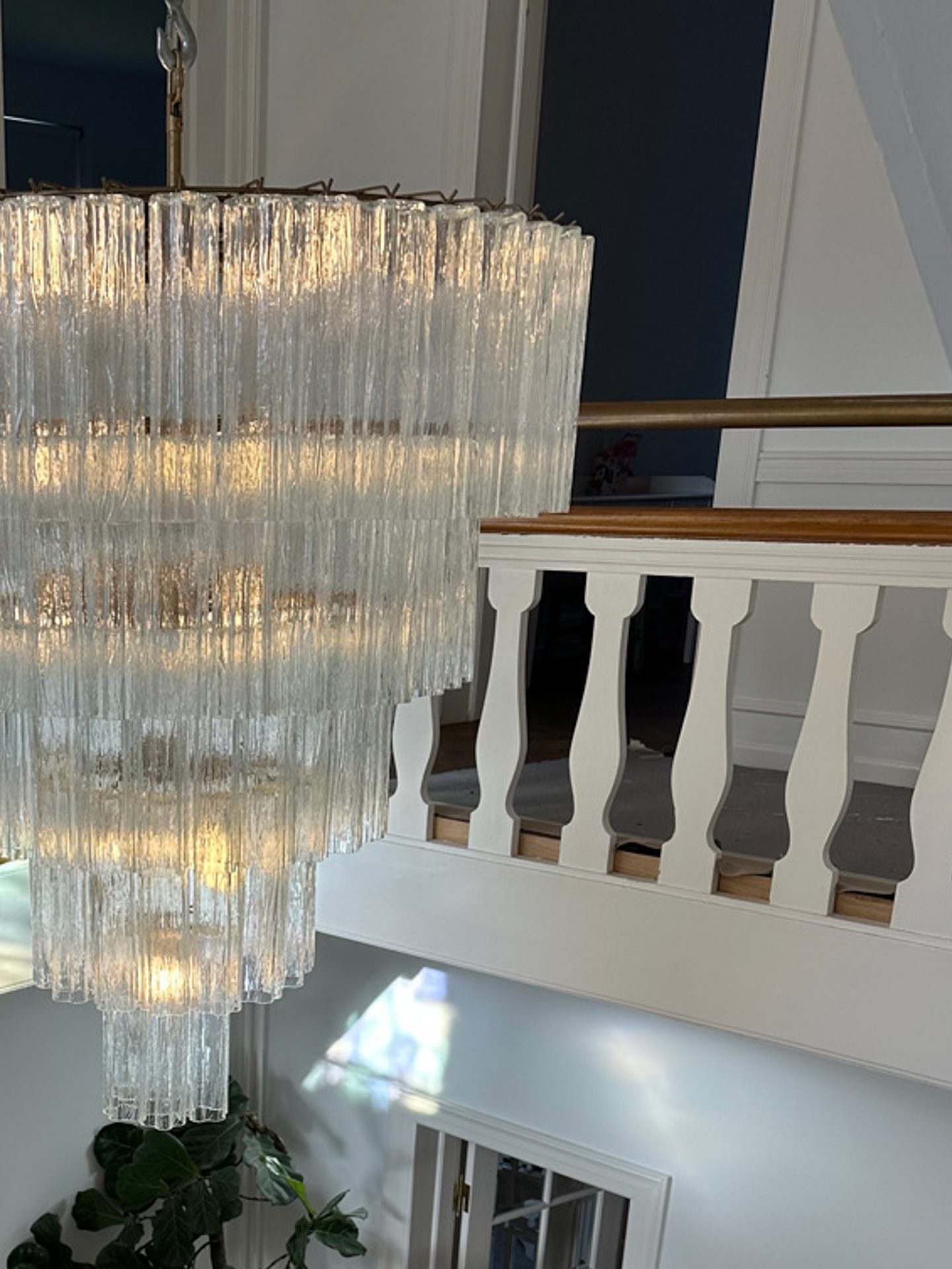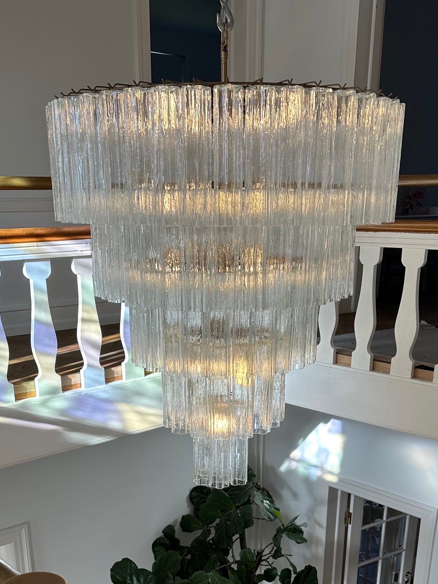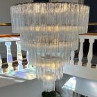 Oplev vores 5-niveau Murano-lysekrone med 119 håndlavede transparente glas tuber. Et fantastisk midtpunkt, der kombinerer udsøgt håndværk med moderne design og bringer en lysende og sofistikeret atmosfære til ethvert rum. Perfekt til at løfte din indretning med luksus og kunstnerisk udsmykning.