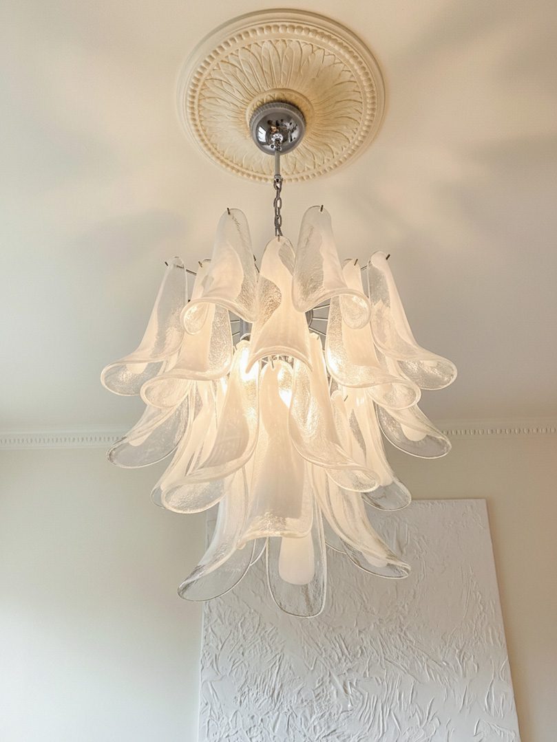 Forkæl dit hjem med en sublim elegance med vores fantastiske italienske lysekrone i Mazzega stil. Denne imponerende lysekrone er prydet med 26 store og imponerende klare/hvide kronblade, der skaber et fortryllende og indbydende lys.