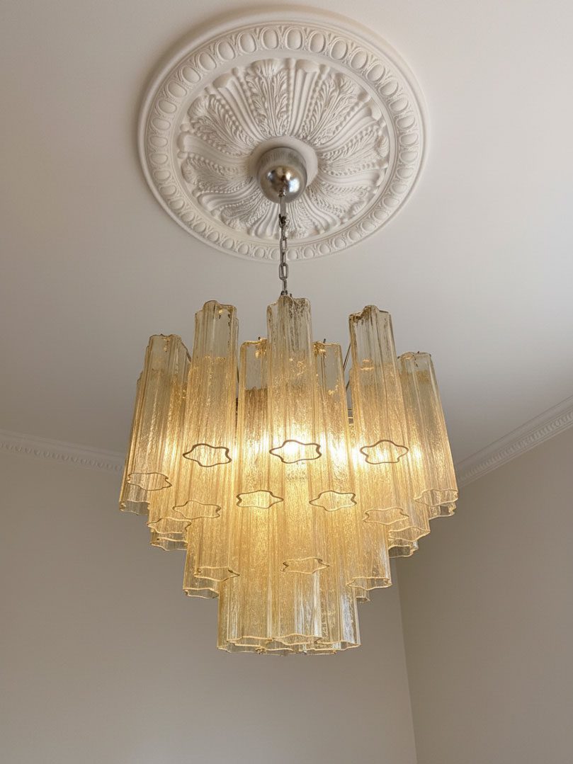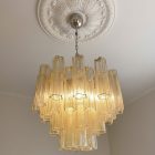 Forkæl dig selv med luksusen og skønheden i denne elegante italienske lysekrone, der vil tilføre et strejf af raffinement til dit hjem. Den er udført i 36 smukke ravfarver Murano tuber, der skaber en stjerneformet konstellation, hvilket gør den til et iøjnefaldende kunstværk.