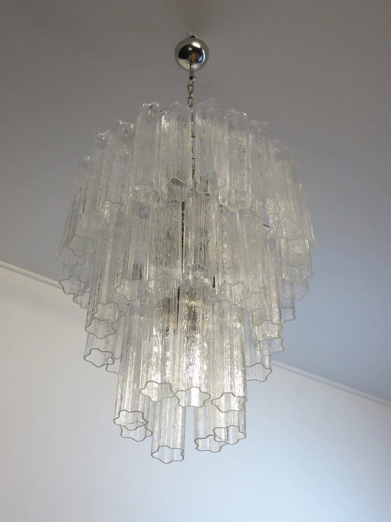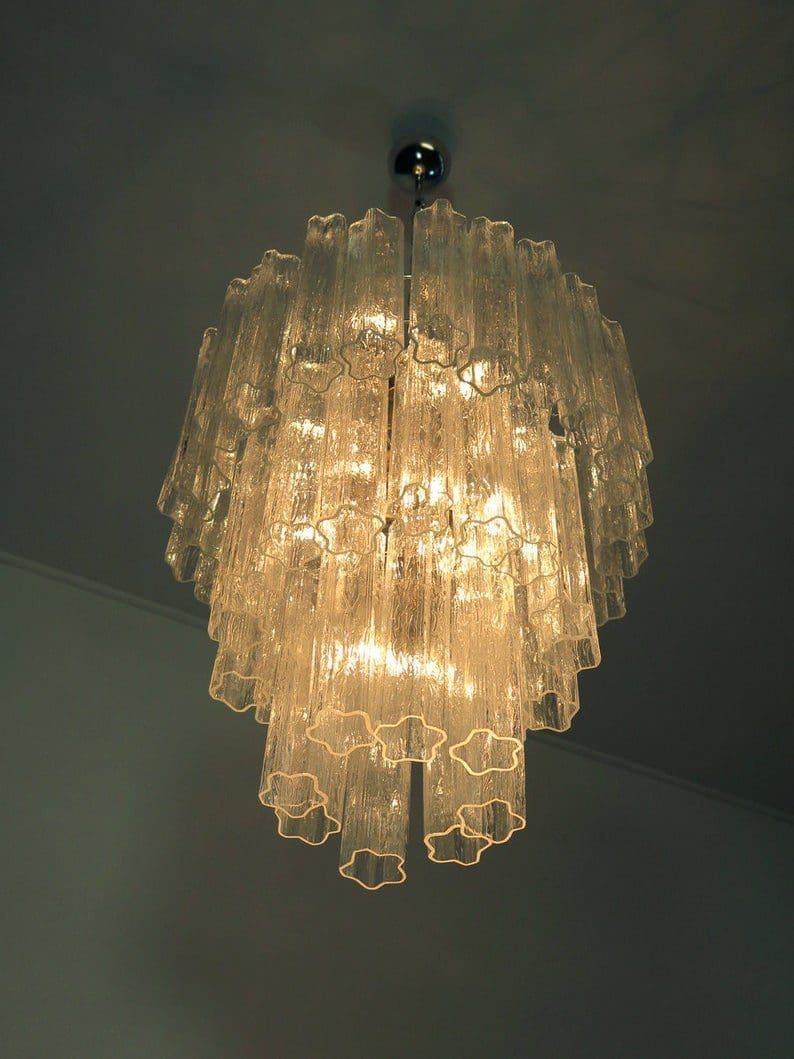 Løft din indretning med den tidløse elegance fra vores store moderne lysekrone i Murano-glas, inspireret af Veninis ikoniske stil. Udformet i traditionel italiensk mid-century-stil, men alligevel produceret i en moderne æra, blander dette udsøgte stykke sømløst klassisk charme med moderne flair.