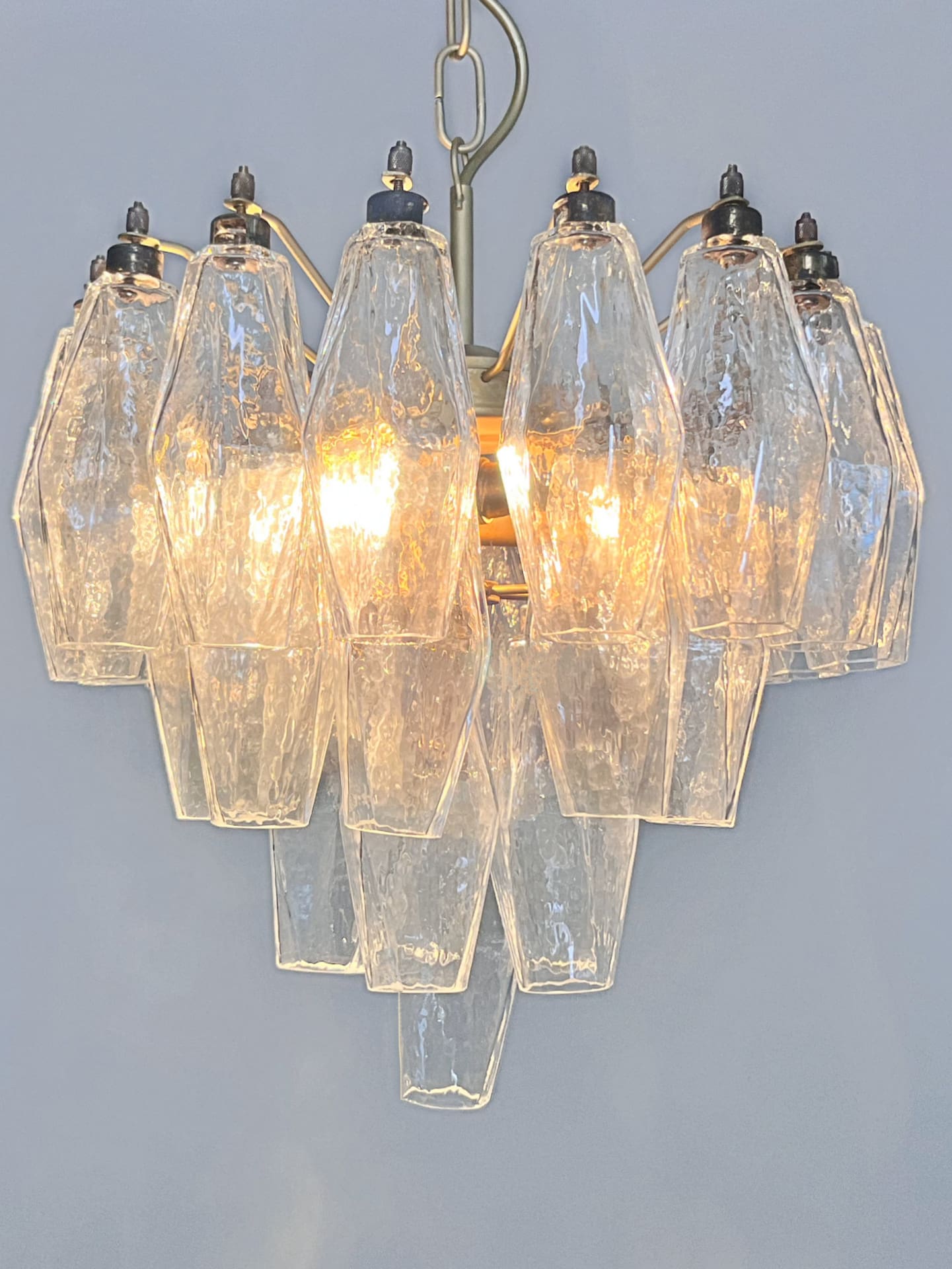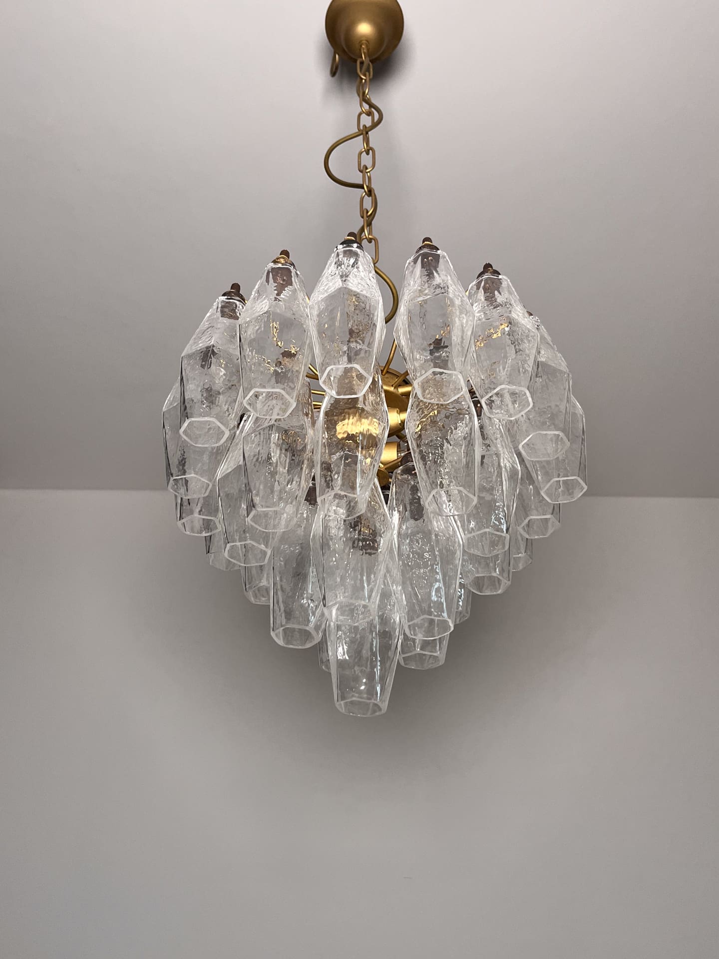 Denne lysekrone er lavet med udsøgt Murano-glas og har en fængslende række af geometriske, facetterede glaselementer, der reflekterer og spreder lyset smukt, hvilket skaber en fascinerende visuel effekt.