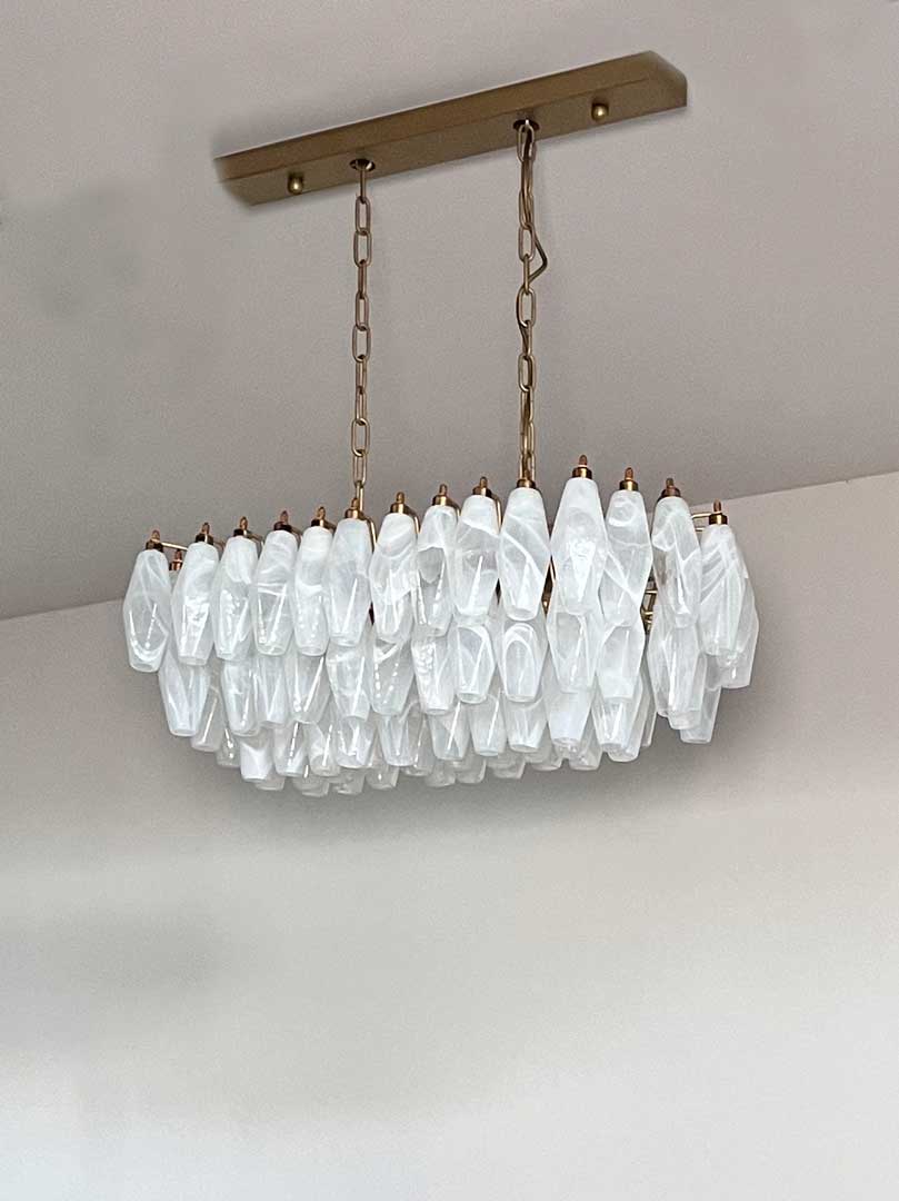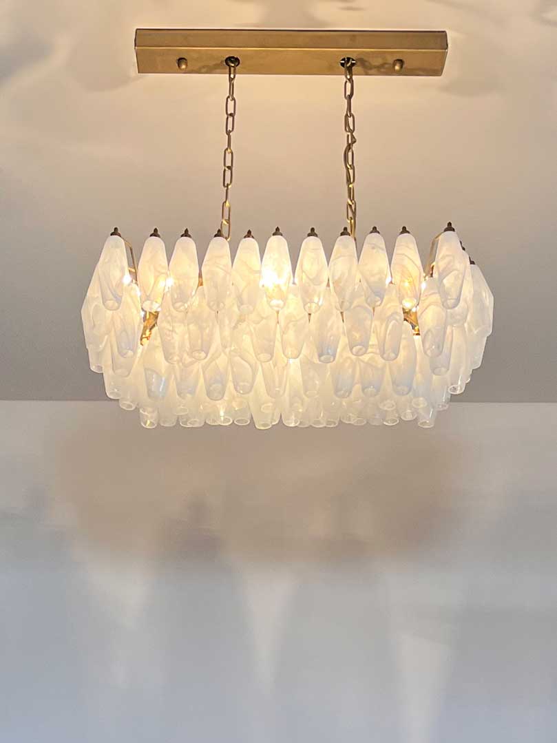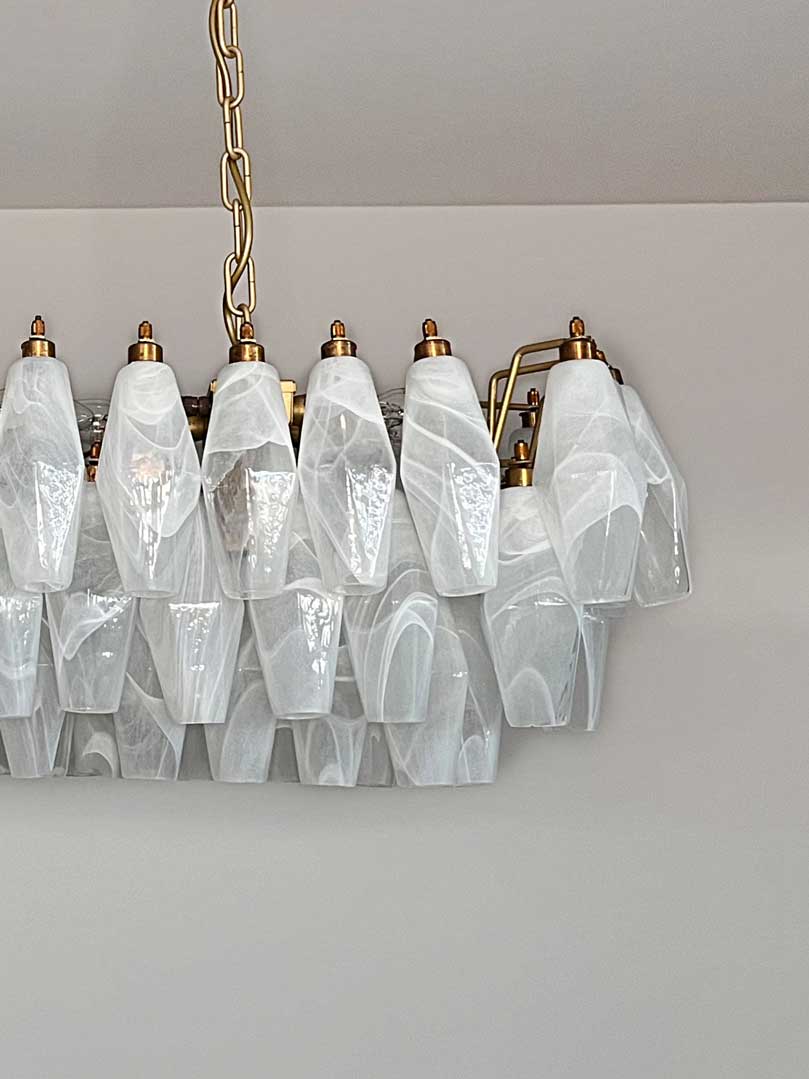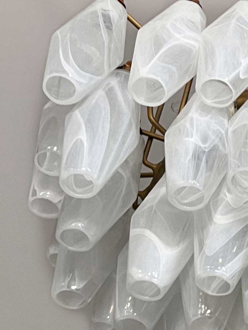 HÃ¥ndlavet af mesterhÃ¥ndværkere i Veneto-regionen, har dette fantastiske stykke et harmonisk arrangement af 84 hvide alabast Poliedri-glaselementer – hver enkelt individuelt formet og udvalgt for sin klarhed og skønhed.