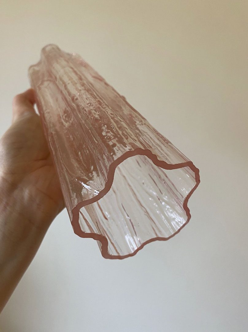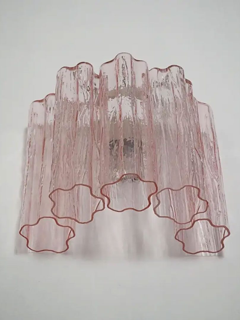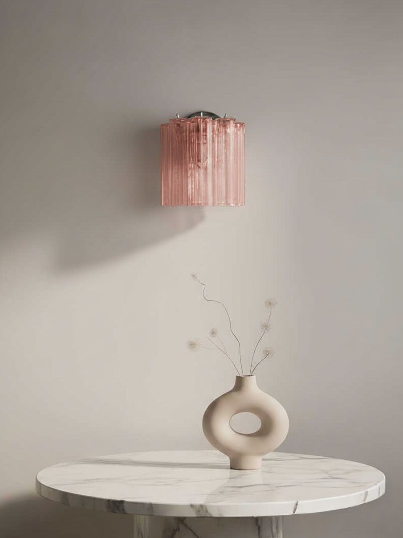 Oplys dit rum med tidløs elegance med denne Murano væglampe i sart lyserødt glas. Designet har fem slanke rørformede elementer, der er fremstillet i Venedig regionen i Italien. Den bløde lyserøde nuance tilføjer en raffineret varme og skaber et fængslende og atmosfærisk lysspil.