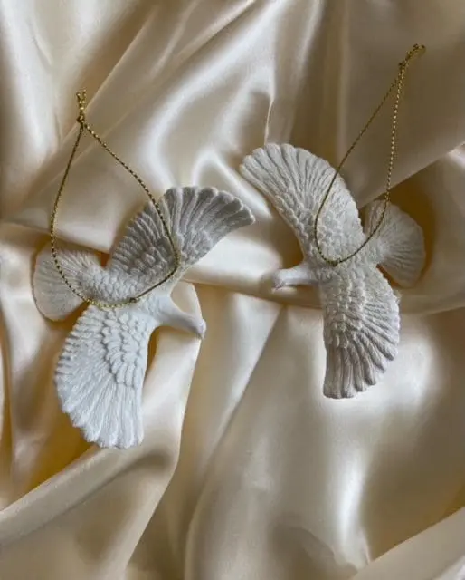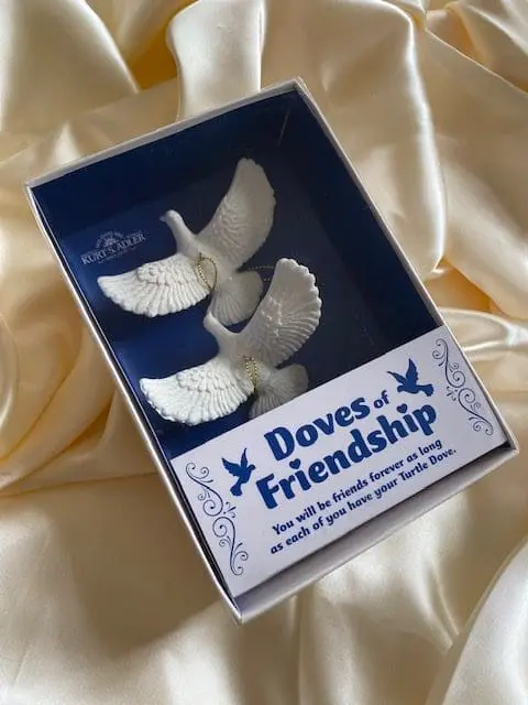 I slutningen af filmen redder hun endda Kevin, da de to grumme skurke, truer ham med en pistol. ´Fugledamen´ bliver den store helt og Kevins ven for livet, da han giver hende en gave i form af en turteldue, han havde fået i legetøjsbutikken. Derfor er disse to yndige venskabs duer den mest perfekte gave, du kan dele med en nær ven i juletiden! Hver gang du ser dette smukke ornament hænge på dit træ, vil du tænke på din elskede ven, som du deler dette minde med. Et fint og unikt symbol på et tæt venskab.